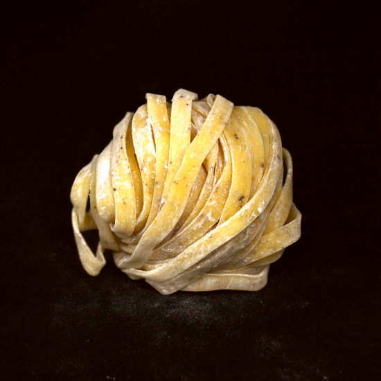 コシと弾力が特徴の淡路麺業こだわりの「タリアテッレ」に、中粗挽きの黒胡椒(ブラックペッパー)を練り込みました。